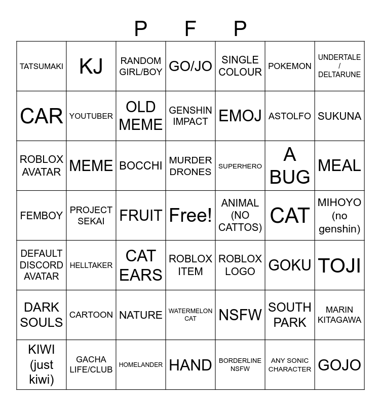 This bingo card has a free space and 48 words: NSFW, ASTOLFO, HAND, PROJECT SEKAI, BOCCHI, MIHOYO (no genshin), KJ, GACHA LIFE/CLUB, POKEMON, ROBLOX ITEM, UNDERTALE / DELTARUNE, GO/JO, A BUG, SUPERHERO, DARK SOULS, CAT, CAR, SUKUNA, SOUTH PARK, SINGLE COLOUR, EMOJ, FRUIT, TATSUMAKI, YOUTUBER, MARIN KITAGAWA, OLD MEME, MEAL, KIWI (just kiwi), MURDER DRONES, MEME, ANY SONIC CHARACTER, ANIMAL (NO CATTOS), TOJI, CARTOON, FEMBOY, ROBLOX LOGO, GOKU, ROBLOX AVATAR, CAT EARS, NATURE, DEFAULT DISCORD AVATAR, GOJO, RANDOM GIRL/BOY, HOMELANDER, GENSHIN IMPACT, WATERMELON CAT, HELLTAKER and BORDERLINE NSFW.