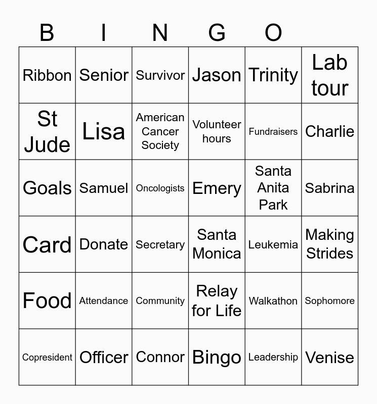 This bingo card has 39 words: Officer, Copresident, Director, St Jude, Secretary, Sabrina, Lisa, Venise, Trinity, Emery, Charlie, Jason, Goals, Oncologists, Samuel, Santa Anita Park, Walkathon, Ribbon, Connor, Card, Lab tour, Leukemia, American Cancer Society, Volunteer hours, Bingo, Community, Food, Leadership, Attendance, Senior, Junior, Sophomore, Survivor, Santa Monica, Making Strides, Relay for Life, Donate, Fundraisers and Research.