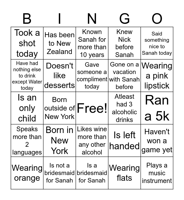 This bingo card has a free space and 24 words: Born in New York, Is not a bridesmaid for Sanah, Gave someone a compliment today, Wearing orange, Said something nice to Sanah today, Took a shot today, Have had nothing else to drink except Water today, Has been to New Zealand, Atleast had 3 alcoholic drinks, Likes wine more than any other alcohol, Gone on a vacation with Sanah before, Is an only child, Is left handed, Haven't won a game yet, Doesn't like desserts, Wearing flats, Ran a 5k, Known Sanah for more than 10 years, Wearing a pink lipstick, Born outside of New York, Plays a music instrument, Speaks more than 2 languages, Knew Nick before Sanah and Is a bridesmaid for Sanah.