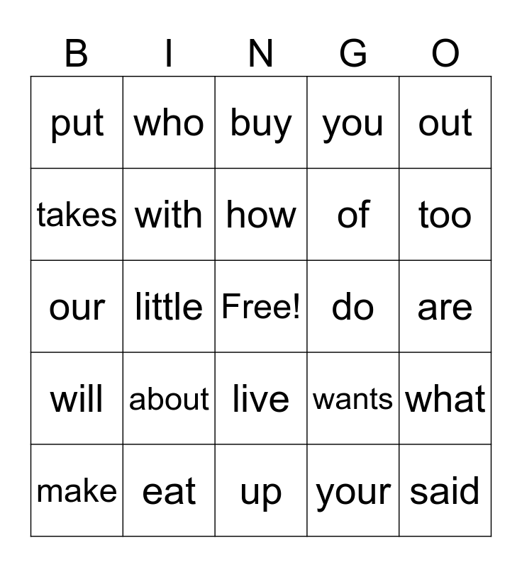 This bingo card has a free space and 24 words: about, eat, how, make, out, put, takes, who, do, live, of, our, wants, what, with, your, are, buy, too, little, said, will, you and up.