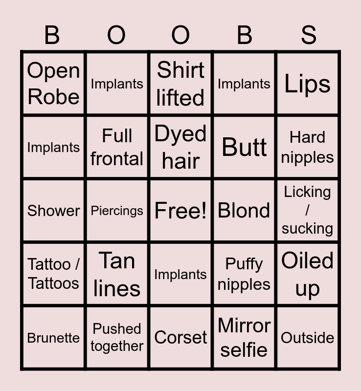 This bingo card has a free space and 29 words: Implants, Pushed together, Shirt lifted, Lingerie, Lips, Open Robe, Full frontal, Dyed hair, Blond, Oiled up, Brunette, Piercings, Mirror selfie, Outside, Shower, Topless in panties, Corset, Puffy nipples, Hard nipples, Tattoo / Tattoos, Tan lines, With toy, Butt, Licking / sucking, Implants, Implants, Implants, Implants and Implants.