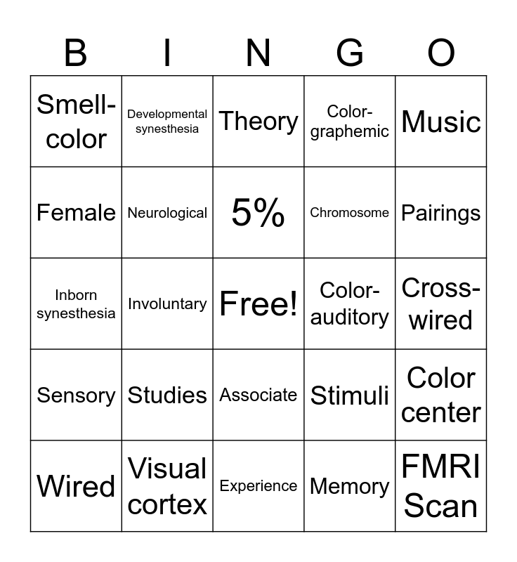 This bingo card has a free space and 36 words: Super-human, Brain, Synesthesia, Neurological, Stimuli, Sensory, 5%, Colors, Music, Numbers, Involuntary, Color-graphemic, Patterns, Color-auditory, Pairings, Smell-color, Balance, Studies, FMRI Scan, Theory, Cross-wired, Color center, Visual cortex, Wired, Experience, Developmental synesthesia, Inborn synesthesia, Genetically passed, Chromosome, Female, Hallucinogenic, Seizures, Memory, Associate, Disorder and Mystery.