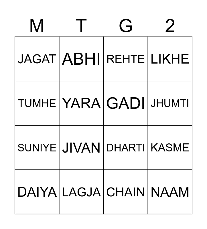 This bingo card has 91 words: YAHI, ARE, AAPKI, WAHA, PHIR, BITI, SUN, CHALO, Free!, WAQT, RAH, RULA, JANAM, JIVAN, TORA, KASME, TAUBA, SUKH, KAISI, KHUDA, DUKH, AAJA, SWAPN, AISE, TUMHE, CHALKA, MEGHA, HUZUR, DIN, RAMIYA, CHUPKE, UDE, ZIHALE, LAGJA, REHTE, LIKHE, JAGAT, NIND, DHARTI, RASIK, DAIYA, YARA, DO, DEKHNE, TUMNE, DUR, PANCHI, RUP, MASTI, CHHOD, MORA, NAAM, GHAR, CHALAT, JHANAK, PARDE, SUNIYE, SANWRE, MOHE, RAJA, BHAI, AAGE, JHUMKA, THANDI, BAG, MILTI, HAMNE, RASME, GORI, INHI, CHAIN, JANE, RAAZ, PANI, GADI, JHUMTI, KORA, BADE, JAOON, NAINO, JALTA, ABHI, MANG, BADRA, PYAR, YAKIN, GEET, JAISE, JATA, RAHI and MANA.