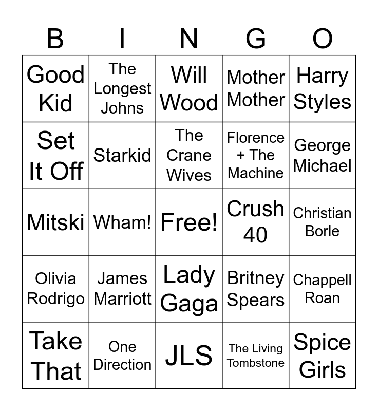This bingo card has a free space and 24 words: James Marriott, One Direction, The Crane Wives, Take That, Harry Styles, Good Kid, Set It Off, The Longest Johns, Crush 40, Lady Gaga, Florence + The Machine, Mitski, Britney Spears, Chappell Roan, Starkid, The Living Tombstone, Christian Borle, Will Wood, George Michael, Wham!, Spice Girls, Olivia Rodrigo, Mother Mother and JLS.