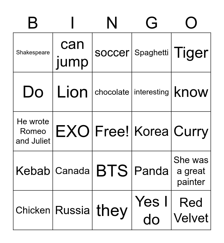 This bingo card has a free space and 39 words: TWICE, Ice cream, America, Lion, Chicken, BTS, chocolate, China, Tiger, Kebab, EXO, Spaghetti, Red Velvet, Curry, Korea, Canada, Mozart, Shakespeare, Kangaroo, Panda, Do, they, interesting, know, you, anything, about, have, He wrote great music, can jump, pizza, India, soccer, Russia, Yes I do, I have no idea, She was a great painter, He wrote Romeo and Juliet and Hamlet.
