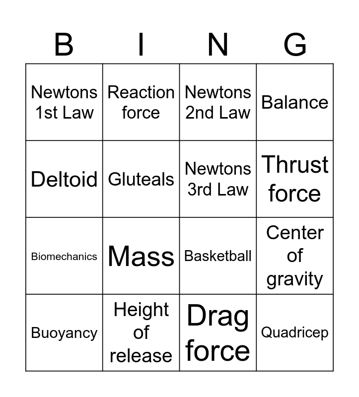 This bingo card has 31 words: Free!, Line of Gravity, Center of gravity, Base of Support, Newtons 1st Law, Newtons 2nd Law, Newtons 3rd Law, Angle of release, Height of release, Weight force, Drag force, Buoyancy, Force summation, Gravity, Mass, Weight, Inertia, Stability, Quadricep, Hamstring, Deltoid, Sumo squat, Action force, Reaction force, Biomechanics, Gluteals, Balance, Basketball, Projectile, Thrust force and Sum.