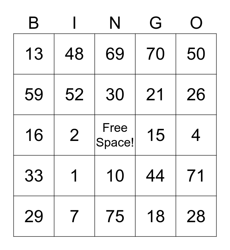 This bingo card has a free space and 24 words: 1, 7, 30, 29, 50, 13, 59, 48, 15, 10, 21, 16, 44, 71, 52, 18, 4, 69, 26, 2, 28, 33, 70 and 75.