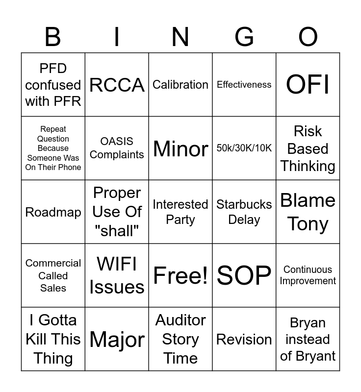 This bingo card has 26 words: Free!, Revision, Minor, Major, OFI, PFD confused with PFR, Repeat Question Because Someone Was On Their Phone, RCCA, Blame Tony, SOP, 50k/30K/10K, Roadmap, Continuous Improvement, I Gotta Kill This Thing, Proper Use Of "shall", Management Review, Effectiveness, Commercial Called Sales, Calibration, Interested Party, Risk Based Thinking, Auditor Story Time, Starbucks Delay, WIFI Issues, OASIS Complaints and Bryan instead of Bryant.