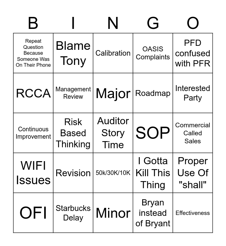 This bingo card has 25 words: Revision, Minor, Major, OFI, PFD confused with PFR, Repeat Question Because Someone Was On Their Phone, RCCA, Blame Tony, SOP, 50k/30K/10K, Roadmap, Continuous Improvement, I Gotta Kill This Thing, Proper Use Of "shall", Management Review, Effectiveness, Commercial Called Sales, Calibration, Interested Party, Risk Based Thinking, Auditor Story Time, Starbucks Delay, WIFI Issues, OASIS Complaints and Bryan instead of Bryant.