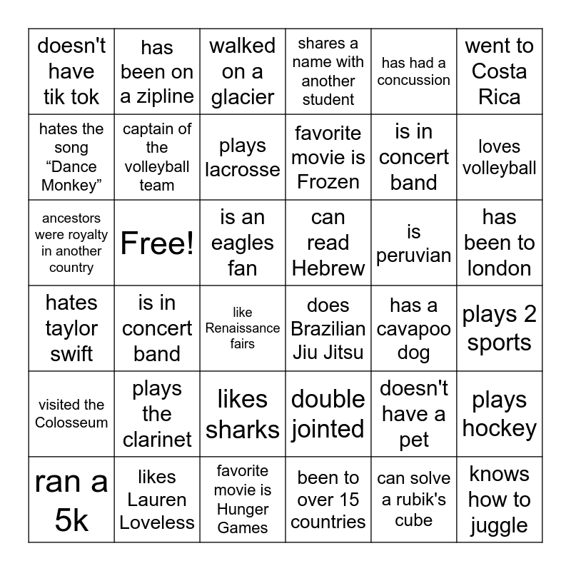 This bingo card has 36 words: double jointed, likes sharks, been to over 15 countries, hates the song “Dance Monkey”, hates taylor swift, can read Hebrew, captain of the volleyball team, favorite movie is Hunger Games, has had a concussion, doesn't have a pet, loves volleyball, shares a name with another student, plays hockey, Free!, favorite movie is Frozen, doesn't have tik tok, visited the Colosseum, is peruvian, ancestors were royalty in another country, walked on a glacier, is an eagles fan, is in concert band, does Brazilian Jiu Jitsu, like Renaissance fairs, has a cavapoo dog, has been on a zipline, is in concert band, likes Lauren Loveless, plays lacrosse, went to Costa Rica, knows how to juggle, ran a 5k, plays 2 sports, has been to london, plays the clarinet and can solve a rubik's cube.