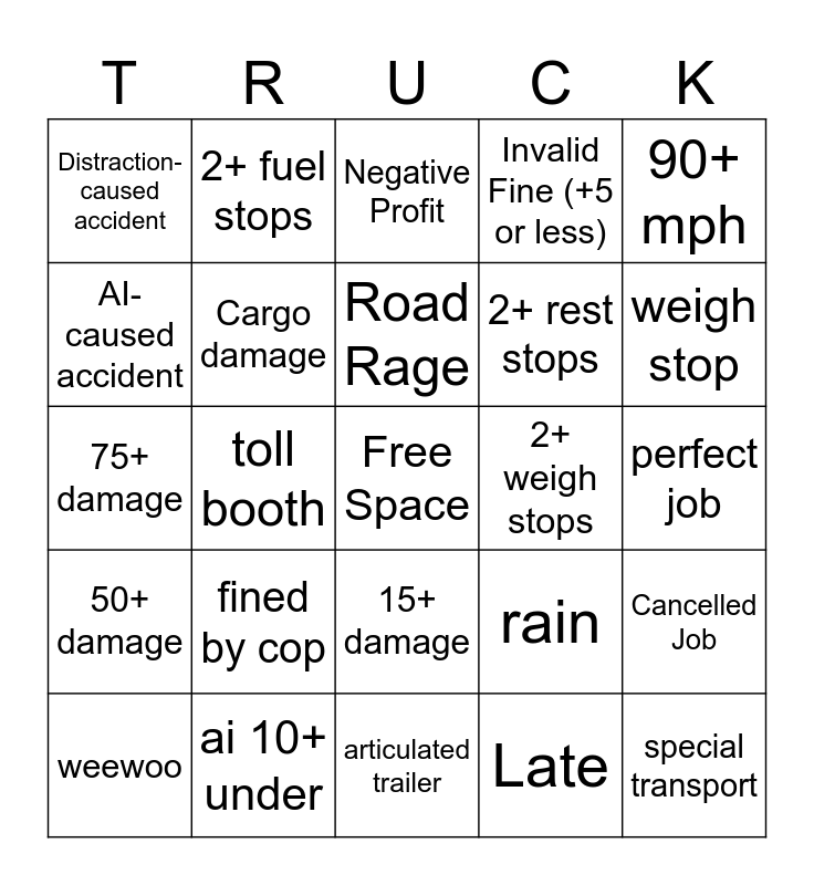 This bingo card has a free space and 24 words: fined by cop, ai 10+ under, Road Rage, weewoo, 90+ mph, Distraction-caused accident, AI-caused accident, 2+ fuel stops, 2+ weigh stops, 15+ damage, 2+ rest stops, 75+ damage, rain, Cancelled Job, Cargo damage, Late, perfect job, Negative Profit, weigh stop, toll booth, special transport, 50+ damage, Invalid Fine (+5 or less) and articulated trailer.