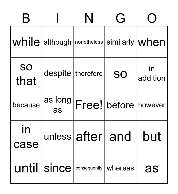 This bingo card has a free space and 24 words: unless, since, therefore, until, when, while, so that, although, before, after, so, because, and, but, despite, whereas, however, nonetheless, in addition, as long as, as, in case, similarly and consequently.
