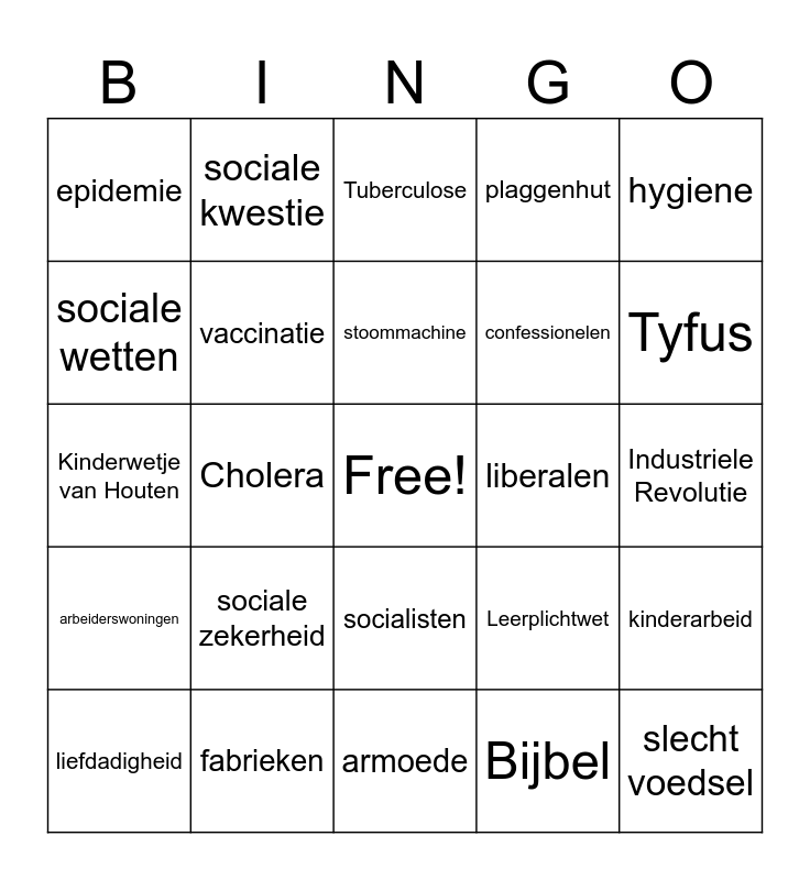 This bingo card has a free space and 24 words: sociale zekerheid, fabrieken, stoommachine, liefdadigheid, hygiene, epidemie, sociale wetten, sociale kwestie, liberalen, socialisten, confessionelen, Kinderwetje van Houten, Leerplichtwet, kinderarbeid, vaccinatie, Bijbel, Industriele Revolutie, Tuberculose, Tyfus, Cholera, slecht voedsel, arbeiderswoningen, plaggenhut and armoede.