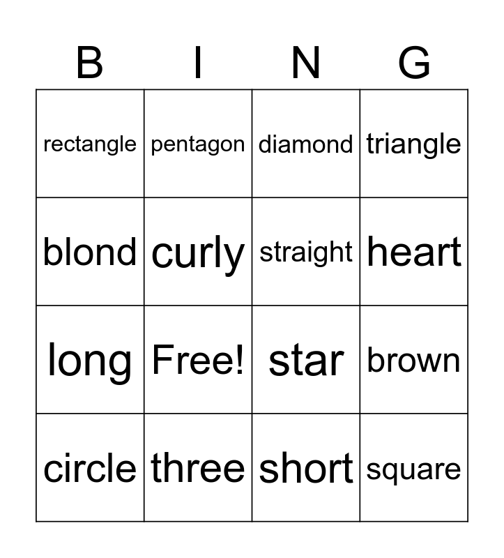 This bingo card has 18 words: Free!, square, diamond, rectangle, star, triangle, circle, pentagon, heart, long, short, blond, brown, curly, straight, bath, three and teeth.