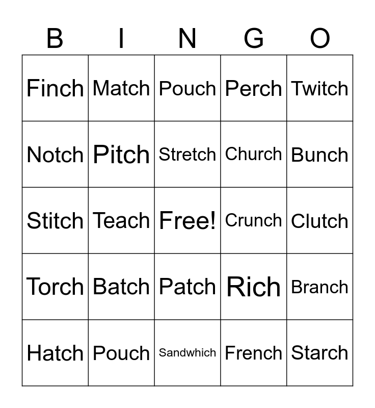This bingo card has a free space and 24 words: Batch, Pouch, Stretch, Hatch, Twitch, Finch, Notch, Match, Crunch, Patch, Church, Stitch, Rich, Branch, Pitch, French, Clutch, Pouch, Bunch, Teach, Starch, Torch, Perch and Sandwhich.