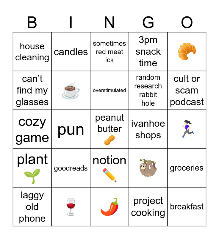 This bingo card has a free space and 24 words: goodreads, π·, overstimulated, laggy old phone, π₯, house cleaning, canβt find my glasses, candles, ivanhoe shops, notion βοΈ, random research rabbit hole, cozy game, π¦₯, groceries, βοΈ, project cooking, ππ»ββοΈ, sometimes red meat ick, cult or scam podcast, pun, breakfast, plant π±, 3pm snack time and πΆοΈ.