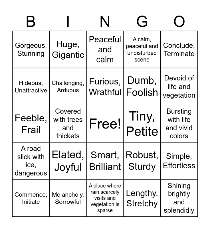 This bingo card has a free space and 24 words: Elated, Joyful, Melancholy, Sorrowful, Furious, Wrathful, Commence, Initiate, Conclude, Terminate, Gorgeous, Stunning, Hideous, Unattractive, Huge, Gigantic, Tiny, Petite, Smart, Brilliant, Dumb, Foolish, Feeble, Frail, Robust, Sturdy, Simple, Effortless, Challenging, Arduous, Lengthy, Stretchy, Bursting with life and vivid colors, Peaceful and calm, Devoid of life and vegetation, Covered with trees and thickets, Shining brightly and splendidly, A road slick with ice, dangerous, A calm, peaceful and undisturbed scene and A place where rain scarcely visits and vegetation is sparse.