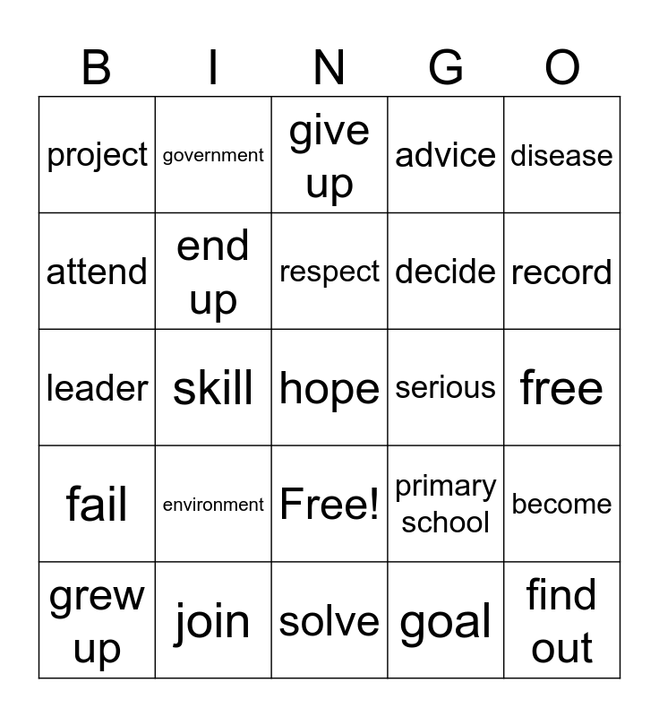 This bingo card has 26 words: Free!, goal, respect, join, disease, project, attend, government, free, primary school, decide, leader, become, grew up, skill, develop, advice, fail, give up, hope, record, solve, serious, environment, end up and find out.