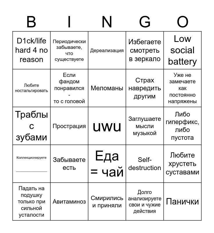 This bingo card has a free space and 24 words: Забываете есть, Авитаминоз, Меломаны, Падать на подушку только при сильной усталости, Low social battery, D1ck/life hard 4 no reason, Любите ностальгировать, Периодически забываете, что существуете, Заглушаете мысли музыкой, Еда = чай, Страх навредить другим, Траблы с зубами, Self-destruction, Любите хрустеть суставами, Если фандом понравился - то с головой, Долго анализируете свои и чужие действия, Либо гиперфикс, либо пустота, Дереализация, Уже не замечаете как постоянно напряжены, Прострация, Панички, Коллекционируете ________________, Избегаете смотреть в зеркало and Смирились и приняли.