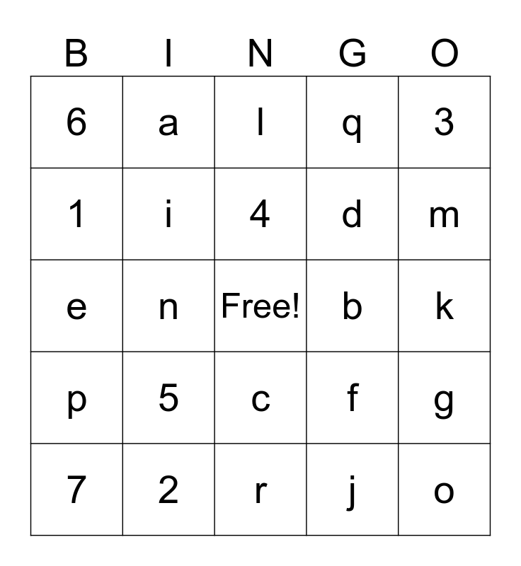 This bingo card has a free space and 24 words: 5, 2, 4, 7, 3, 6, 1, a, b, c, d, e, f, g, i, j, k, l, m, n, o, p, q and r.