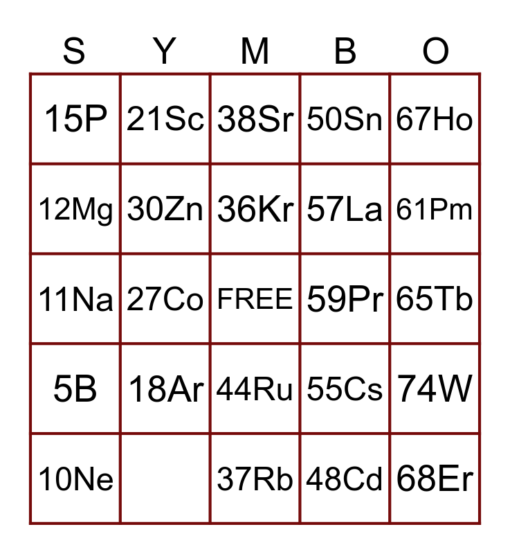 This bingo card has a free space and 25 words: 5B, 18Ar, 36Kr, 48Cd, 61Pm, 15P, 21Sc, 50Sn, 65Tb, 10Ne, 27Co, 57La, 74W, 13Al, 30Zn, 44Ru, 55Cs, 67Ho, 12Mg, 37Rb, 59Pr, 68Er, 11Na, 38Sr and 58Ce.