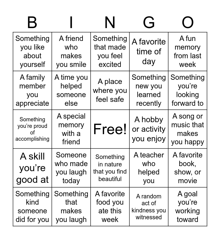 This bingo card has a free space and 25 words: Someone who made you laugh today, A favorite food you ate this week, A place where you feel safe, Something kind someone did for you, A fun memory from last week, Something you like about yourself, A family member you appreciate, A friend who makes you smile, A hobby or activity you enjoy, Something in nature that you find beautiful, Something new you learned recently, Something you’re proud of accomplishing, A teacher who helped you, A favorite book, show, or movie, A time you helped someone else, Something that made you feel calm, A song or music that makes you happy, Something that made you feel excited, Something you’re looking forward to, A special memory with a friend, A goal you’re working toward, Something that makes you laugh, A skill you’re good at, A favorite time of day and A random act of kindness you witnessed.
