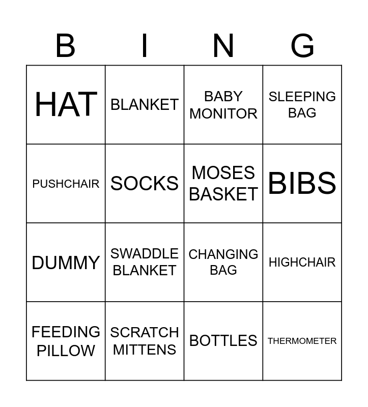 This bingo card has 26 words: NAPPIES, BABY WIPES, BIBS, COT, PUSHCHAIR, HAT, SOCKS, BLANKET, BOTTLES, STERILISER, DUMMY, CHANGING BAG, CHANGING MAT, NUBY RAPID COOL, HIGHCHAIR, SLEEPSUIT, SLEEPING BAG, THERMOMETER, BABY MONITOR, FEEDING PILLOW, SWADDLE BLANKET, BOTTLE BRUSH, SCRATCH MITTENS, BABY CARRIER, MOSES BASKET and CAR SEAT.