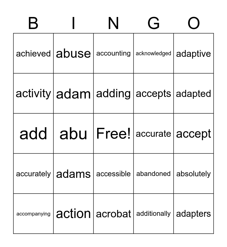 This bingo card has a free space and 147 words: a, aa, aaa, aaron, ab, abandoned, abc, aberdeen, abilities, ability, able, aboriginal, abortion, about, above, abraham, abroad, abs, absence, absent, absolute, absolutely, absorption, abstract, abstracts, abu, abuse, ac, academic, academics, academy, acc, accent, accept, acceptable, acceptance, accepted, accepting, accepts, access, accessed, accessibility, accessible, accessing, accessories, accessory, accident, accidents, accommodate, accommodation, accommodations, accompanied, accompanying, accomplish, accomplished, accordance, according, accordingly, account, accountability, accounting, accounts, accreditation, accredited, accuracy, accurate, accurately, accused, acdbentity, ace, acer, achieve, achieved, achievement, achievements, achieving, acid, acids, acknowledge, acknowledged, acm, acne, acoustic, acquire, acquired, acquisition, acquisitions, acre, acres, acrobat, across, acrylic, act, acting, action, actions, activated, activation, active, actively, activists, activities, activity, actor, actors, actress, acts, actual, actually, acute, ad, ada, adam, adams, adaptation, adapted, adapter, adapters, adaptive, adaptor, add, added, addiction, adding, addition, additional, additionally, additions, address, addressed, addresses, addressing, adds, adelaide, adequate, adidas, adipex, adjacent, adjust, adjustable, adjusted, adjustment, adjustments, admin, administered, administration and administrat.