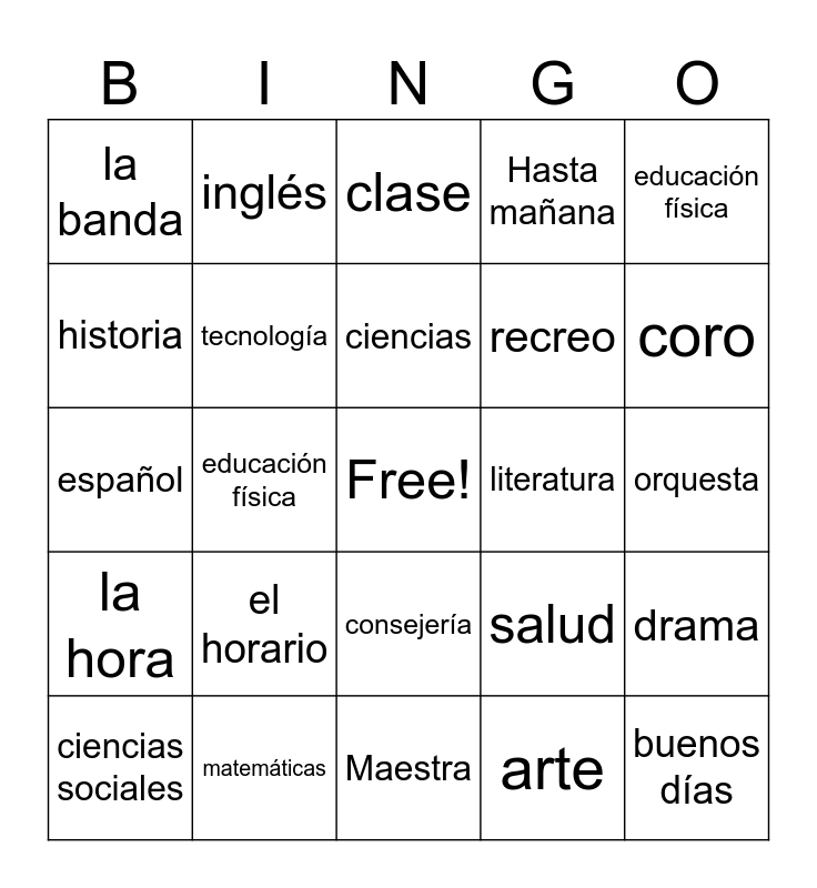 This bingo card has a free space and 24 words: el horario, matemáticas, ciencias, ciencias sociales, educación física, la banda, historia, inglés, literatura, consejería, recreo, español, salud, drama, tecnología, arte, orquesta, clase, coro, educación física, buenos días, la hora, Hasta mañana and Maestra.
