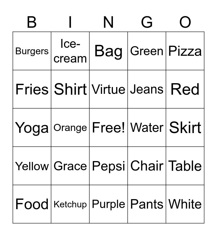 This bingo card has a free space and 24 words: Grace, Ketchup, Virtue, Food, Pizza, Burgers, Fries, Ice-cream, Water, Pepsi, Jeans, Yoga, Chair, Table, Shirt, Pants, Skirt, Bag, Red, Orange, White, Yellow, Green and Purple.