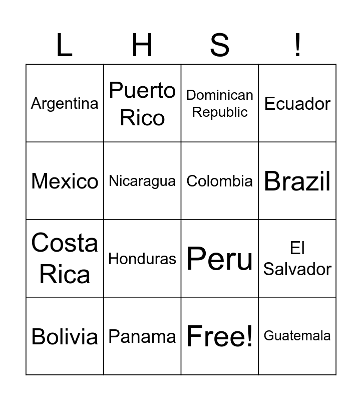This bingo card has 18 words: Honduras, Guatemala, Dominican Republic, Argentina, Peru, Ecuador, Bolivia, Puerto Rico, Brazil, Costa Rica, Free!, Mexico, El Salvador, Nicaragua, Colombia, Venezuela, Panama and Chile.