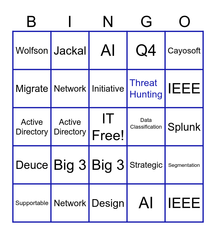 This bingo card has a free space and 49 words: Ping Pong, IEEE, Supportable, Design, Big 3, Deuce, Jackal, Cyber Haven, Migrate, Remediation, Network, Q4, Segmentation, Strategic, Splunk, Flash Blades, Initiative, Data Classification, Infrastructure, Cayosoft, Active Directory, AI, Wolfson, Threat Hunting, Ping Pong, IEEE, Supportable, Design, Big 3, Deuce, Jackal, CyberHaven, Migrate, Remediation, Network, Q4, Segmentation, Strategic, Splunk, Flash Blades, Initiative, Data Classification, Infrastructure, Cayosoft, Active Directory, AI, Wolfson, Leadership and Threat Hunting.