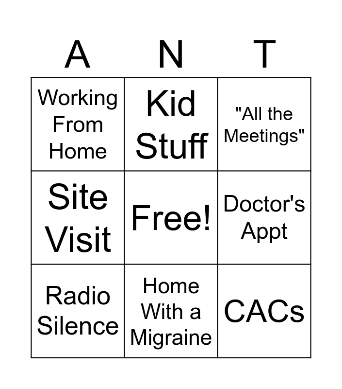 This bingo card has a free space and 8 words: Doctor's Appt, "All the Meetings", Kid Stuff, Radio Silence, Working From Home, CACs, Site Visit and Home With a Migraine.