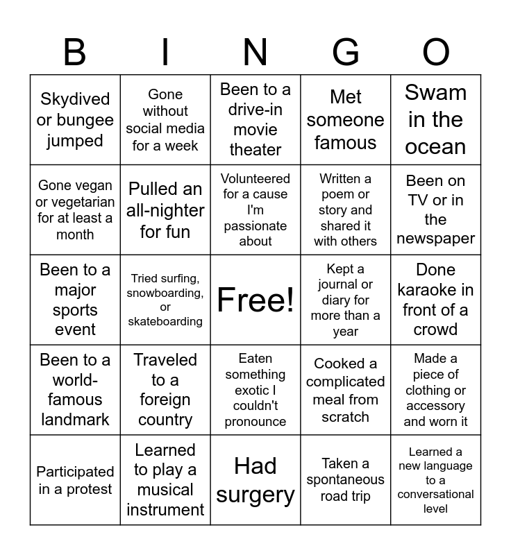 This bingo card has a free space and 24 words: Traveled to a foreign country, Learned to play a musical instrument, Volunteered for a cause I'm passionate about, Participated in a protest, Swam in the ocean, Skydived or bungee jumped, Gone vegan or vegetarian for at least a month, Gone without social media for a week, Kept a journal or diary for more than a year, Eaten something exotic I couldn't pronounce, Written a poem or story and shared it with others, Been to a major sports event, Cooked a complicated meal from scratch, Made a piece of clothing or accessory and worn it, Pulled an all-nighter for fun, Taken a spontaneous road trip, Done karaoke in front of a crowd, Been to a drive-in movie theater, Been on TV or in the newspaper, Tried surfing, snowboarding, or skateboarding, Learned a new language to a conversational level, Been to a world-famous landmark, Met someone famous and Had surgery.