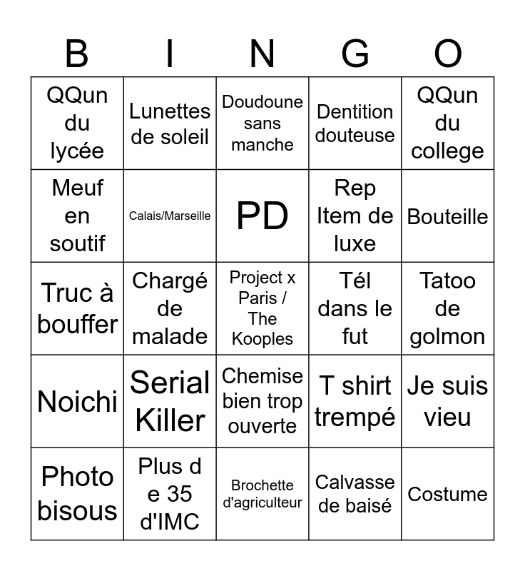 This bingo card has a free space and 26 words: Chemise bien trop ouverte, Calvasse de baisé, PD, Plus d e 35 d'IMC, QQun du college, QQun du lycée, Meuf en soutif, Lunettes de soleil, Tatoo de golmon, T shirt trempé, Rep Item de luxe, Truc à bouffer, Je suis vieu, Photo bisous, Chargé de malade, Noirgueule, Dentition douteuse, Noichi, Doudoune sans manche, Costume, Bouteille, Brochette d'agriculteur, Tél dans le fut, Serial Killer, Calais/Marseille and T'es encore là toi ?.