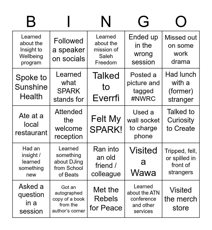 This bingo card has a free space and 24 words: Learned something about DJing from School of Beats, Got an autographed copy of a book from the author’s corner, Talked to Everrfi, Asked a question in a session, Missed out on some work drama, Learned about the Insight to Wellbeing program, Spoke to Sunshine Health, Followed a speaker on socials, Used a wall socket to charge phone, Ran into an old friend / colleague, Posted a picture and tagged #NWRC, Ate at a local restaurant, Visited a Wawa, Tripped, fell, or spilled in front of strangers, Learned what SPARK stands for, Learned about the ATN conference and other services, Talked to Curiosity to Create, Learned about the mission of Saleh Freedom, Had lunch with a (former) stranger, Attended the welcome reception, Visited the merch store, Had an insight / learned something new, Ended up in the wrong session and Met the Rebels for Peace.
