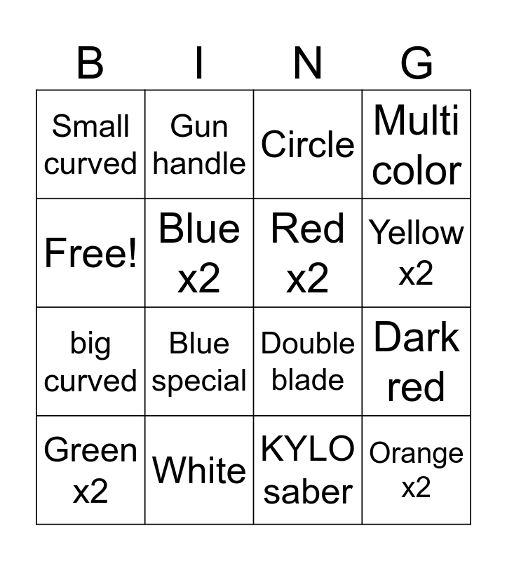 This bingo card has 16 words: White, Dark red, Circle, Small curved, big curved, Gun handle, Double blade, KYLO saber, Free!, Blue x2, Green x2, Multi color, Blue special, Yellow x2, Red x2 and Orange x2.