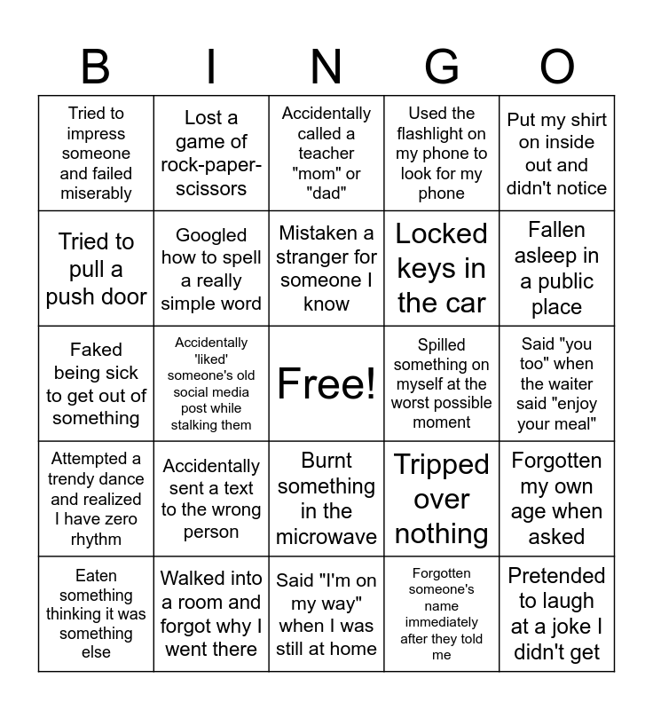 This bingo card has a free space and 24 words: Accidentally sent a text to the wrong person, Walked into a room and forgot why I went there, Mistaken a stranger for someone I know, Eaten something thinking it was something else, Put my shirt on inside out and didn't notice, Tried to impress someone and failed miserably, Tried to pull a push door, Lost a game of rock-paper-scissors, Spilled something on myself at the worst possible moment, Burnt something in the microwave, Locked keys in the car, Faked being sick to get out of something, Tripped over nothing, Forgotten my own age when asked, Googled how to spell a really simple word, Forgotten someone's name immediately after they told me, Said "you too" when the waiter said "enjoy your meal", Accidentally called a teacher "mom" or "dad", Fallen asleep in a public place, Accidentally 'liked' someone's old social media post while stalking them, Pretended to laugh at a joke I didn't get, Attempted a trendy dance and realized I have zero rhythm, Used the flashlight on my phone to look for my phone and Said "I'm on my way" when I was still at home.