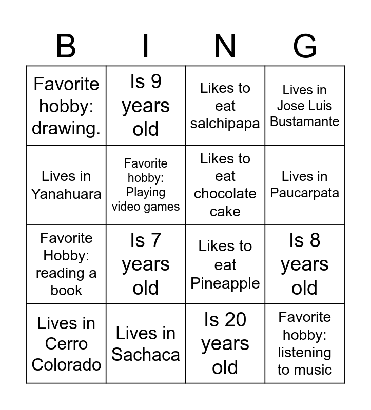 This bingo card has 16 words: Lives in Sachaca, Is 8 years old, Likes to eat salchipapa, Favorite hobby: drawing., Favorite Hobby: reading a book, Is 9 years old, Likes to eat Pineapple, Is 20 years old, Lives in Yanahuara, Favorite hobby: Playing video games, Lives in Cerro Colorado, Lives in Jose Luis Bustamante, Is 7 years old, Lives in Paucarpata, Likes to eat chocolate cake and Favorite hobby: listening to music.