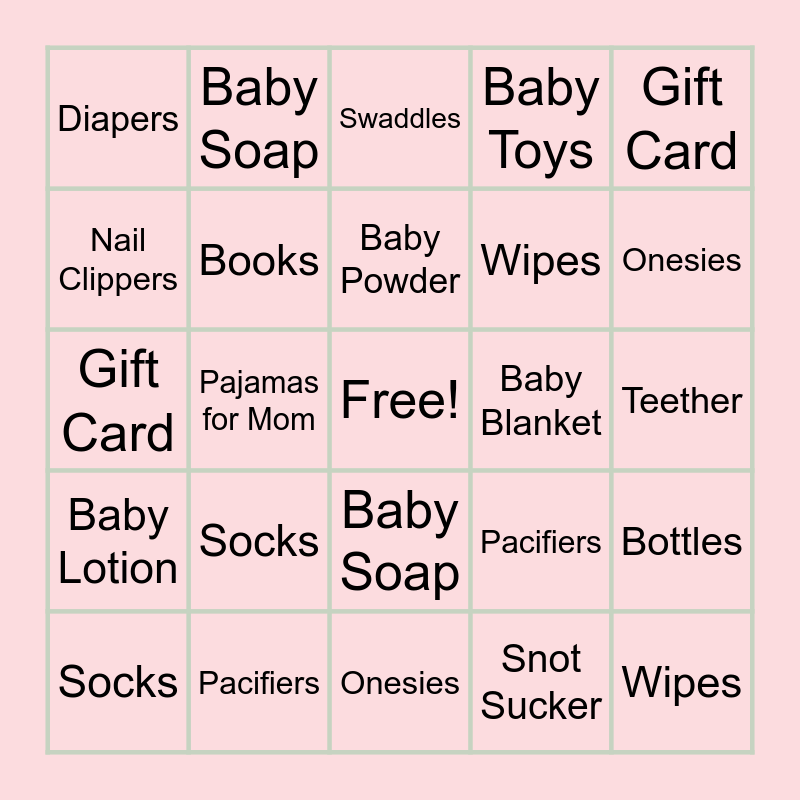 ⚠ This card has duplicate items: Diapers (2), Wipes (2), Burp Cloths (2), Onesies (2), Socks (2), Bows (2), Baby Soap (2), Baby Lotion (2), Nail Clippers (2), Bibs (2), Books (2), Baby Toys (2), Bottles (2), Pacifiers (2), Teether (2), Stuffed Animal (2), Baby Powder (2), Baby Blanket (2), Swaddles (2), Gift Card (2), Pajamas for Mom (2), Snot Sucker (2)