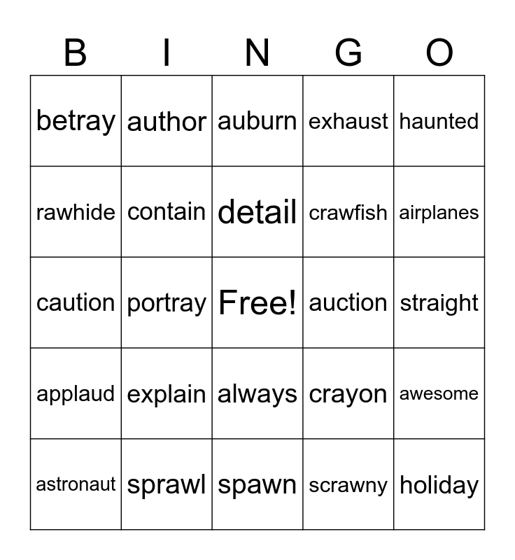 This bingo card has a free space and 28 words: awesome, awful, crawfish, scrawny, rawhide, auburn, author, applaud, auction, astronaut, caution, exhaust, sprawl, spawn, airplanes, complain, explain, contain, detail, always, betray, archway, holiday, portray, straight, crayon, haunted and straws.