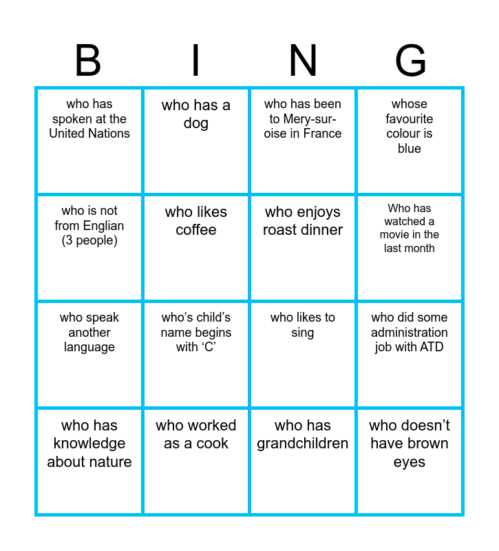 This bingo card has 16 words: who worked as a cook, who did some administration job with ATD, who has been to Mery-sur-oise in France, who has spoken at the United Nations, who speak another language, who has a dog, who likes to sing, who has grandchildren, who is not from Englian (3 people), who likes coffee, who has knowledge about nature, whose favourite colour is blue, who’s child’s name begins with ‘C’, Who has watched a movie in the last month, who enjoys roast dinner and who doesn’t have brown eyes.