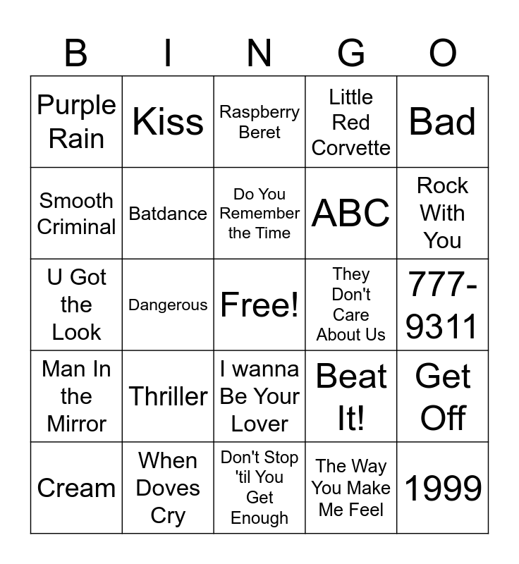 This bingo card has a free space and 24 words: Thriller, When Doves Cry, Do You Remember the Time, Cream, Bad, Purple Rain, Smooth Criminal, Kiss, They Don't Care About Us, I wanna Be Your Lover, ABC, U Got the Look, Beat It!, Get Off, Batdance, The Way You Make Me Feel, 777-9311, Raspberry Beret, Rock With You, Dangerous, 1999, Man In the Mirror, Little Red Corvette and Don't Stop 'til You Get Enough.