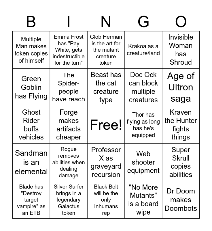This bingo card has a free space and 44 words: Juggernaut is a Juggernaut creature type, Dr Doom makes Doombots, Master Mold - Legendary Artifact, makes Sentinels, Blade has "Destroy target vampire" as an ETB, Wolverine's flavour text says "Bub", "No More Mutants" is a board wipe, Glob Herman is the art for the mutant creature token, Sebastian Shaw has a "Stuffy Doll" ability, Invisible Woman has Shroud, Silver Surfer brings in a legendary Galactus token, Krakoa as a creature/land, Thor has flying as long has he's equipped, Professor X as graveyard recursion, Rogue removes abilities when dealing damage, Gambit deals damage when you discard cards, Black Bolt will be the only Inhumans rep, Moira MacTaggart draws cards, Ghost Rider buffs vehicles, Fantasticar has Crew 4, Age of Ultron saga, Emma Frost has "Pay White, gets indestructible for the turn", Quicksilver has Haste and First Strike, Kitty Pride can phase out, Multiple Man makes token copies of himself, Genosha is a Mutant Matters Land, Kraven the Hunter fights things, Sol Ring is the Arc Reactor, Mind stone is Mind Stone, Web shooter equipment, Sandman is an elemental, Namor is a Merfolk with flying, Super Skrull copies abilities, Danger Room is an enchantment, Cyclops has "pay x red, deal x damage to target creature", Forge makes artifacts cheaper, The FF together will be WUBRG, Loki goads creatures, "Phoenix Saga" Saga, Beast has the cat creature type, Green Goblin has Flying, Doc Ock can block multiple creatures, "To me my X-Men" is a mutant tutor instant, The Spider-people have reach and Cerebro is an artifact that draws cards.