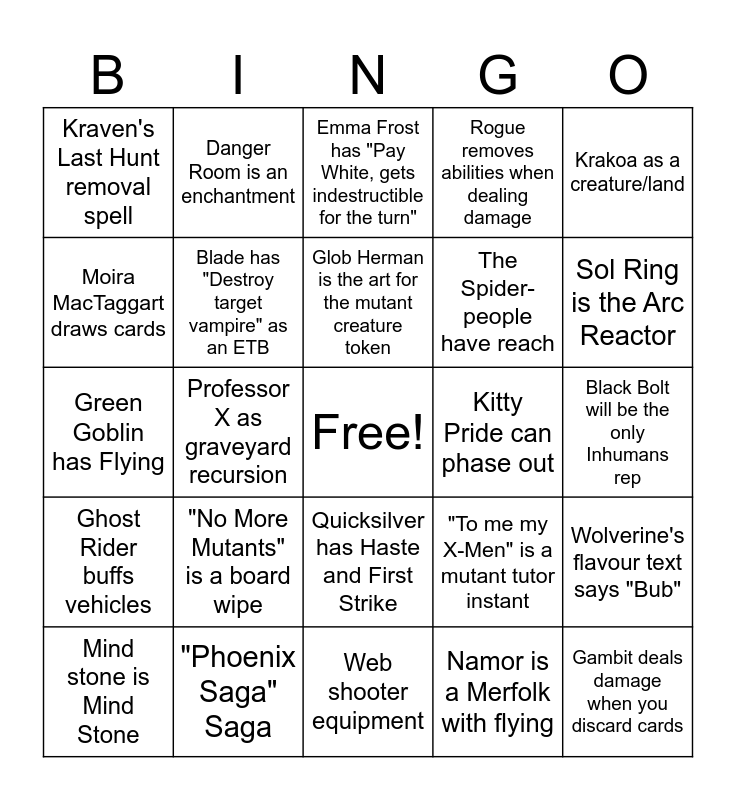 This bingo card has a free space and 37 words: Juggernaut is a Juggernaut creature type, Dr Doom makes Doombots, Master Mold - Legendary Artifact, makes Sentinels, Blade has "Destroy target vampire" as an ETB, Wolverine's flavour text says "Bub", "No More Mutants" is a board wipe, Glob Herman is the art for the mutant creature token, Silver Surfer brings in a legendary Galactus token, Krakoa as a creature/land, Thor has flying as long has he's equipped, Professor X as graveyard recursion, Rogue removes abilities when dealing damage, Gambit deals damage when you discard cards, Black Bolt will be the only Inhumans rep, Moira MacTaggart draws cards, Ghost Rider buffs vehicles, Fantasticar has Crew 4, Emma Frost has "Pay White, gets indestructible for the turn", Quicksilver has Haste and First Strike, Kitty Pride can phase out, Kraven's Last Hunt removal spell, Sol Ring is the Arc Reactor, Mind stone is Mind Stone, Web shooter equipment, Sandman is an elemental, Namor is a Merfolk with flying, Danger Room is an enchantment, Cyclops has "pay x red, deal x damage to target creature", Forge makes artifacts cheaper, The FF together will be WUBRG, Loki goads creatures, "Phoenix Saga" Saga, Green Goblin has Flying, Doc Ock can block multiple creatures, "To me my X-Men" is a mutant tutor instant, The Spider-people have reach and Cerebro is an artifact that draws cards.
