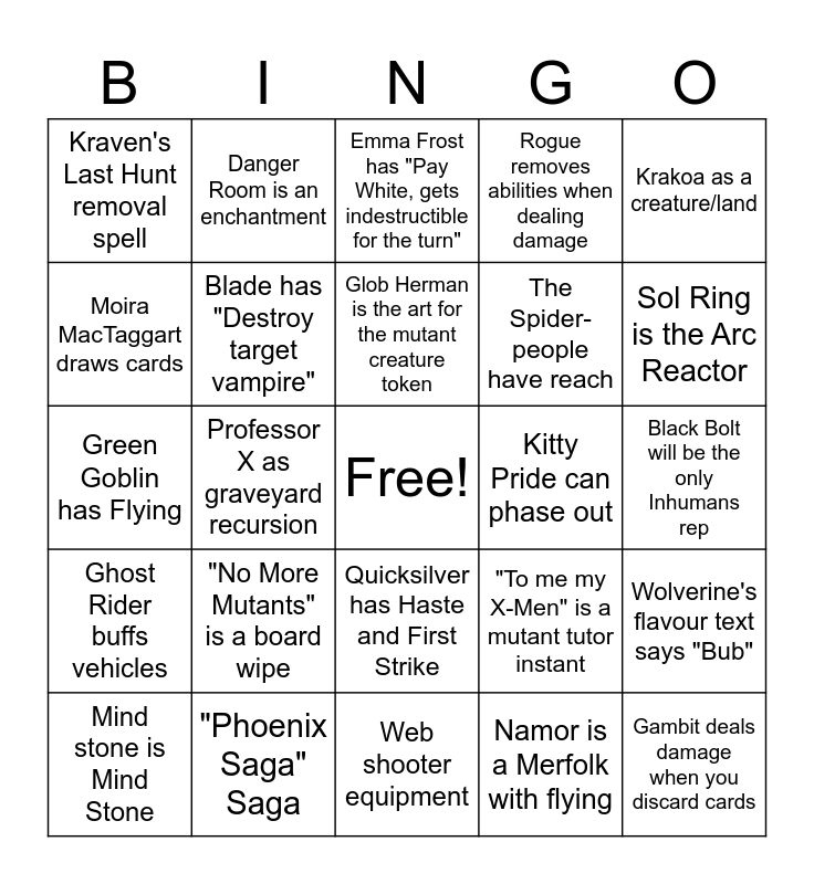 This bingo card has a free space and 37 words: Juggernaut is a Juggernaut creature type, Dr Doom makes Doombots, Master Mold - Legendary Artifact, makes Sentinels, Blade has "Destroy target vampire", Wolverine's flavour text says "Bub", "No More Mutants" is a board wipe, Glob Herman is the art for the mutant creature token, Silver Surfer brings in a legendary Galactus token, Krakoa as a creature/land, Thor has flying as long has he's equipped, Professor X as graveyard recursion, Rogue removes abilities when dealing damage, Gambit deals damage when you discard cards, Black Bolt will be the only Inhumans rep, Moira MacTaggart draws cards, Ghost Rider buffs vehicles, Fantasticar has Crew 4, Emma Frost has "Pay White, gets indestructible for the turn", Quicksilver has Haste and First Strike, Kitty Pride can phase out, Kraven's Last Hunt removal spell, Sol Ring is the Arc Reactor, Mind stone is Mind Stone, Web shooter equipment, Sandman is an elemental, Namor is a Merfolk with flying, Danger Room is an enchantment, Cyclops has "pay x red, deal x damage to target creature", Forge makes artifacts cheaper, The FF together will be WUBRG, Loki goads creatures, "Phoenix Saga" Saga, Green Goblin has Flying, Doc Ock can block multiple creatures, "To me my X-Men" is a mutant tutor instant, The Spider-people have reach and Cerebro is an artifact that draws cards.