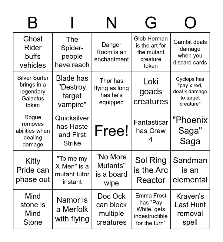 This bingo card has a free space and 35 words: Juggernaut is a Juggernaut creature type, Dr Doom makes Doombots, Master Mold - Legendary Artifact, makes Sentinels, Blade has "Destroy target vampire", "No More Mutants" is a board wipe, Glob Herman is the art for the mutant creature token, Silver Surfer brings in a legendary Galactus token, Krakoa as a creature/land, Thor has flying as long has he's equipped, Professor X as graveyard recursion, Rogue removes abilities when dealing damage, Gambit deals damage when you discard cards, Black Bolt will be the only Inhumans rep, Moira MacTaggart draws cards, Ghost Rider buffs vehicles, Fantasticar has Crew 4, Emma Frost has "Pay White, gets indestructible for the turn", Quicksilver has Haste and First Strike, Kitty Pride can phase out, Kraven's Last Hunt removal spell, Sol Ring is the Arc Reactor, Mind stone is Mind Stone, Sandman is an elemental, Namor is a Merfolk with flying, Danger Room is an enchantment, Cyclops has "pay x red, deal x damage to target creature", Forge makes artifacts cheaper, The FF together will be WUBRG, Loki goads creatures, "Phoenix Saga" Saga, Green Goblin has Flying, Doc Ock can block multiple creatures, "To me my X-Men" is a mutant tutor instant, The Spider-people have reach and Cerebro is an artifact that draws cards.
