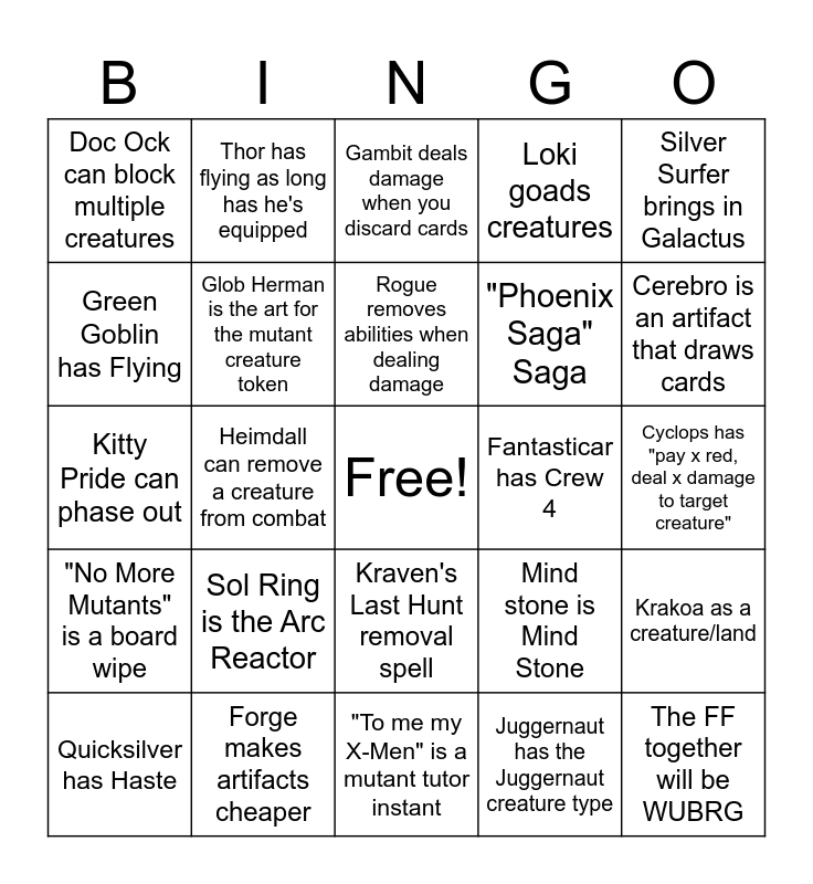 This bingo card has a free space and 32 words: Juggernaut has the Juggernaut creature type, Master Mold - Legendary Artifact, makes Sentinels, Heimdall can remove a creature from combat, Blade has "Destroy target vampire", "No More Mutants" is a board wipe, Glob Herman is the art for the mutant creature token, Silver Surfer brings in Galactus, Krakoa as a creature/land, Thor has flying as long has he's equipped, Professor X as graveyard recursion, Rogue removes abilities when dealing damage, Gambit deals damage when you discard cards, Black Bolt will be the only Inhumans rep, Ghost Rider buffs vehicles, Fantasticar has Crew 4, Emma Frost has "Pay White, gets indestructible for the turn", Quicksilver has Haste, Kitty Pride can phase out, Kraven's Last Hunt removal spell, Sol Ring is the Arc Reactor, Mind stone is Mind Stone, Namor is a Merfolk with flying, Cyclops has "pay x red, deal x damage to target creature", Forge makes artifacts cheaper, The FF together will be WUBRG, Loki goads creatures, "Phoenix Saga" Saga, Green Goblin has Flying, Doc Ock can block multiple creatures, "To me my X-Men" is a mutant tutor instant, The Spider-people have reach and Cerebro is an artifact that draws cards.