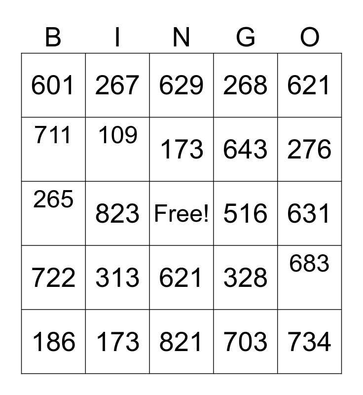 This bingo card has a free space and 24 words: 313, 173, 173, 186, 621, 601, 711, 267, 516, 621, 643, 265, 328, 683, 109, 703, 631, 629, 276, 823, 734, 722, 268 and 821.