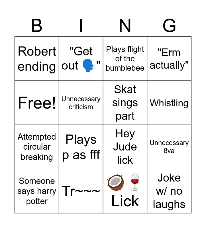 This bingo card has 16 words: Tr~~~, Unnecessary 8va, Plays flight of the bumblebee, Robert ending, Attempted circular breaking, "Get out 🗣️", Hey Jude lick, 🥥🍷 Lick, Free!, Unnecessary criticism, Someone says harry potter, "Erm actually", Plays p as fff, Whistling, Skat sings part and Joke w/ no laughs.